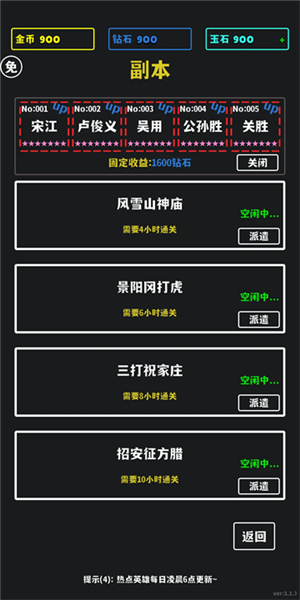 4、2小时副本与10小时副本的平均收益相同,因此可以依据自身拥有的英雄以及可支配的时间,来决定选择挂机哪个副本。