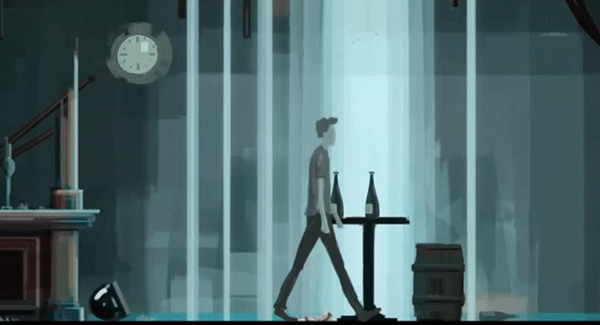 5、下楼后,往右走,来到一家酒吧。进入酒吧后,在桌上找到一包烟,里面依旧只有三根。期间可以点击右上角的时钟,能看到酒吧破损不堪(估计这地方在拆迁)。径直往右走,来到桌子附近,点击左上角的时钟,场景随即变化。把酒吧里的3瓶酒喝完后,男主就醉了,画面中出现了一些酒瓶和躺着的人的图案。