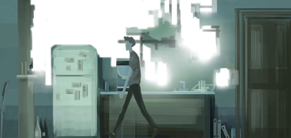 4、随后时间来到第二天,男主角起床坐在床边,房间的墙壁开始出现破损,右侧的床头灯掉落在地,他对此没有在意,还是点击了右上角的时钟,场景随即再次切换——男女主角一同坐在床上,男主摆弄着自己的笔记本电脑,女主则在一旁看着他的电脑屏幕。之后便和之前一样,两人穿好衣服来到客厅,男主照旧喝了杯咖啡,静坐片刻,抽了根烟,然后下楼,继续去追寻那些与女主共度的美好回忆。