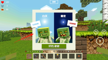 1、游戏开始时可选择白天或黑夜模式,两种模式下僵尸的攻击强度有所区别,确认选择后,即可进入包含草地与树木场景的游戏世界。