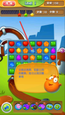 3、战斗过程中,按照指引交换指定的糖果(红箭头所指向的那个),通过匹配三种颜色的糖果来消除目标糖果,从而完成Level1的任务。