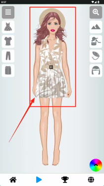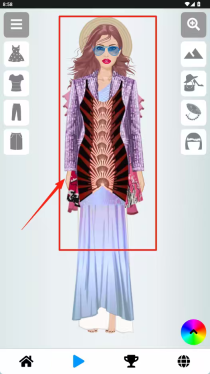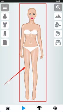 2、留意中间的女模特,从左右两边的图标里挑选衣服与配饰,底部的四个按钮是用来切换不同功能页面的。