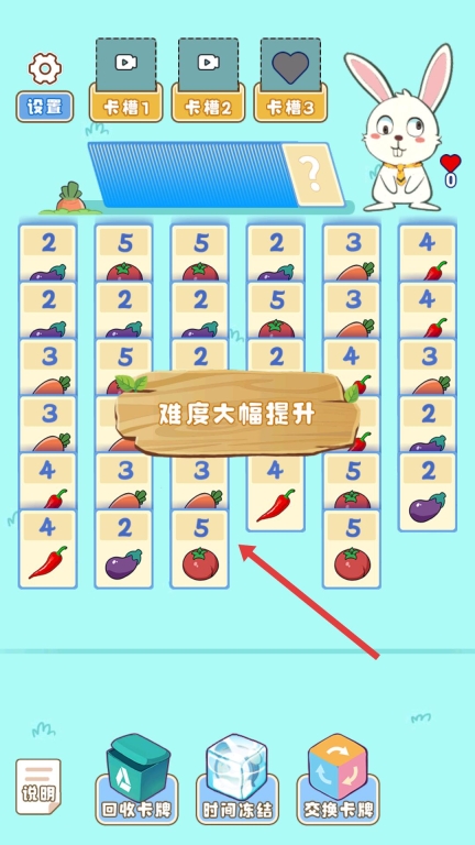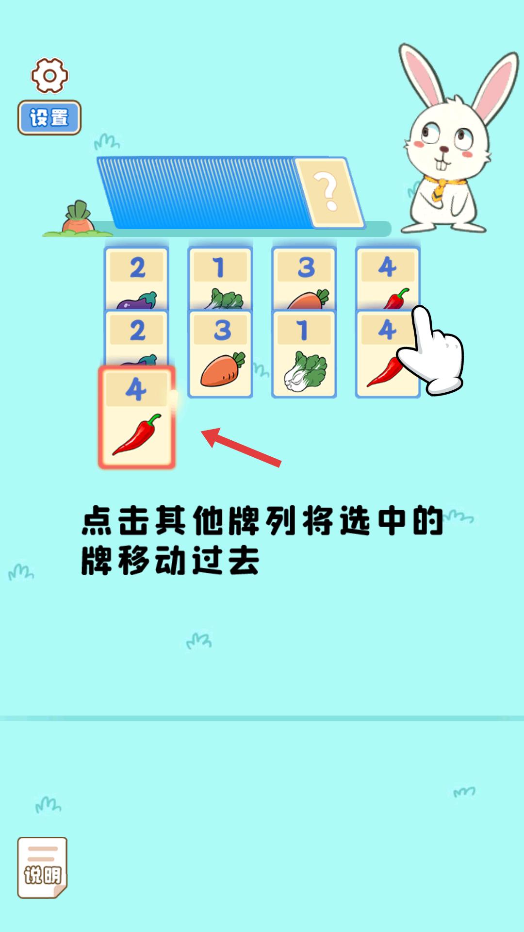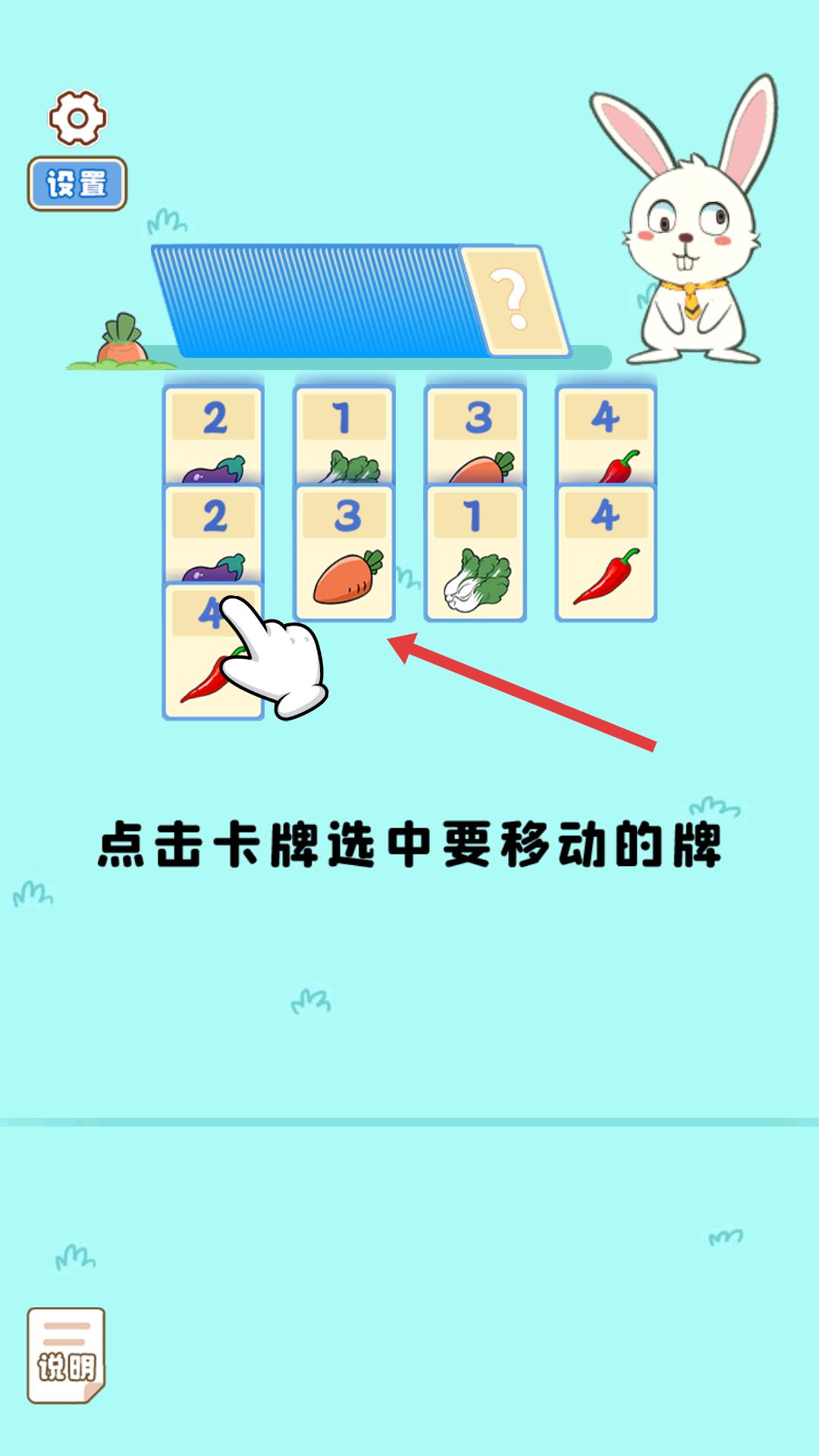 1、点击带有数字与蔬菜图案的卡牌,选定需要移动的牌,以便为后续调整牌的位置预先做好准备。