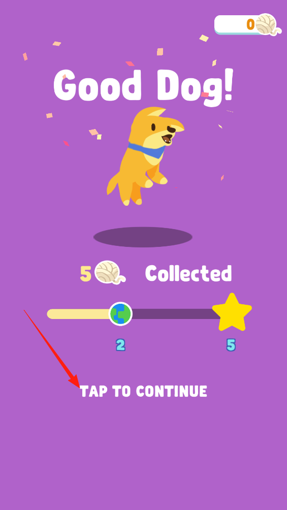3、当屏幕上出现“Good Dog”字样时,意味着目标已经达成;“5Collected”代表本次冒险收获了5个物品;进度条直观显示目前已解锁2个区域;积攒的5颗星星可用于兑换全新装扮,现在点击“Tap to Continue”就能开启下一段冒险啦。