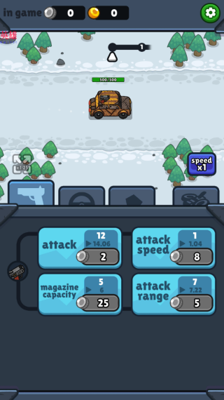 3. 如下图所示,僵尸出现后战车将自动移动并射击,击败僵尸会掉落银币与金币,玩家可利用这些金钱升级武器和战车。